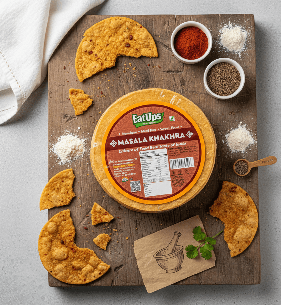 Masala Khakhra from EatUps is a bold and flavorful snack crafted with authentic Indian spices. Made with whole wheat flour and roasted to perfection, it combines the crunch of khakhra with the zest of masala seasoning. Packed with proteins, fiber, and a delightful spice mix, it’s an irresistible choice for tea-time or on-the-go snacking. A healthy, roasted, and tasty alternative to fried snacks—perfect for spice lovers!
