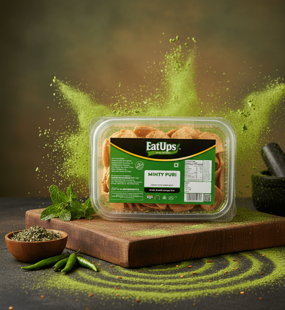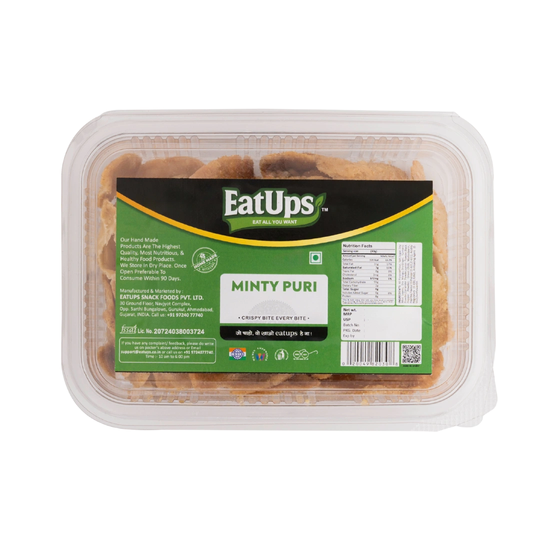 EatUps Minty Puri is a handmade, light, and crunchy snack infused with refreshing mint flavors. Crafted with high-quality ingredients, it delivers a perfect blend of taste and health. Considered among the best namkeen puri options, each bite is crispy, refreshing, and satisfying — making it a unique alternative to traditional snacks. With hygienic preparation and freshness guaranteed for up to 90 days, you can easily buy minty puri online and enjoy this flavorful, wholesome snack anytime.